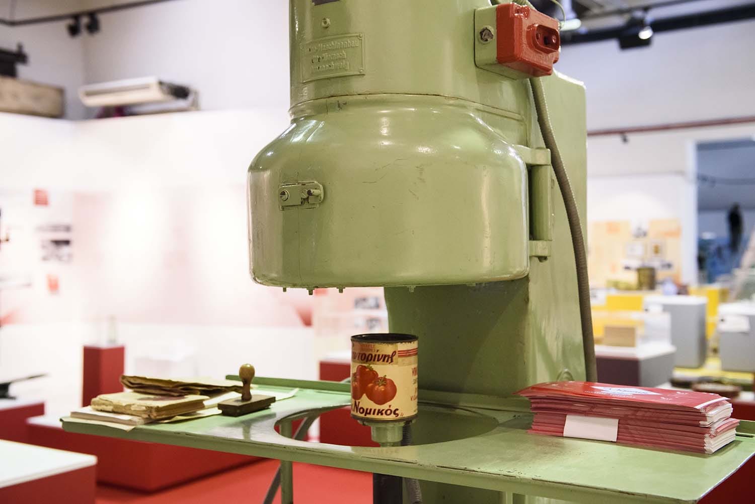 Πρώτη στάση: Μηχανουργείο. Δεύτερη: Αποθήκη. Περιηγούμαστε στις δύο αίθουσες της Τεχνόπολης και στο ιδιαίτερο στήσιμο που εμπνέεται από τις εμπορικές και κλαδικές εκθέσεις, με 8 χρώματα να κυριαρχούν, ένα για κάθε κλάδο της ελληνικής βιομηχανικής ανάπτυξης: μέταλλα, χημικά, οικοδομικά υλικά και ύλες, ενέργεια, τρόφιμα και ποτά, κλωστοϋφαντουργία και ένδυση, καπνός, ξύλο και έπιπλο. 100 βιομηχανίες παρελαύνουν μπροστά στα μάτια μας μέσα από 800 αντικείμενα, μηχανήματα, πρώτες ύλες, παραγόμενα προϊόντα, πλούσιο οπτικοακουστικό υλικό, διαδραστικά παιχνίδια, προβολές και κρυμμένες πληροφορίες, για να καταλάβουμε πολύ γρήγορα ότι η βιομηχανία δεν είναι κάτι μακρινό, αλλά βρίσκεται καθημερινά δίπλα μας, μέσα στη ζωή μας…