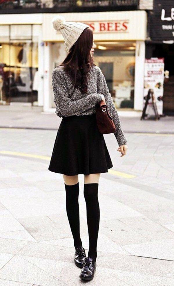 Συνδύασε τη μίνι μαύρη φούστα σου με ένα ζεστό γκρι πουλόβερ, μαύρες over the knee κάλτσες, τα oxfords ή τα δετά σου παπούτσια με ένα μπεζ σκούφο και μία τσάντα σε παρόμοιους τόνους.