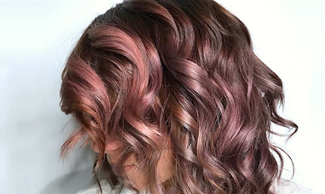 Έπειτα η Hannah χρησιμοποίησε 5 διαφορετικές αποχρώσεις : σκούρο καστανό, medium θερμό καστανό, μωβ και δύο διαφορετικά ροζ. Πήρε ανόμοιες τούφες με διαγώνια κατεύθυνση και ξεκίνησε να τις βάφει βάζοντας το μωβ μέσα στις διάφορες καστανές αποχρώσεις και το ροζ μέσα στο μωβ δημιουργώντας μία σχεδόν ιριδίσουσα υφή πάνω στα μαλλιά.