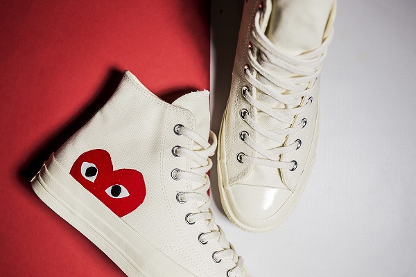 Η συλλογή Comme des Garçons x Converse Chuck Taylor All Star επανακυκλοφορεί σε δύο αποχρώσεις (υπόλευκο και μαύρο) με το πάνινο high- top sneaker να διακοσμείται από τις σήμα κατατεθέν καρδιές του οίκου Comme des Garçons στα πλάγια του παπουτσιού. Στο πίσω μέρος αυτών των Chuck Taylor All Star, ξεχωρίζει μια μαύρη και μια άσπρη ρίγα αντίστοιχα για τις δύο διαφορετικές αποχρώσεις, ενώ η μύτη του παπουτσιού παραμένει στρογγυλεμένη και με την χαρακτηριστική μονή σόλα από καουτσούκ.