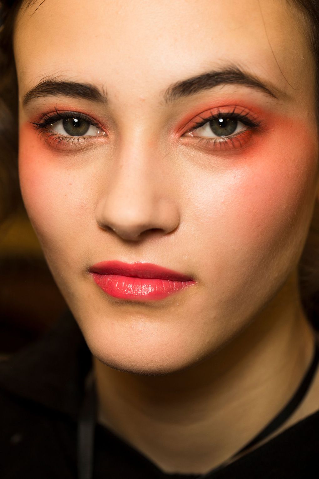 Makeup : H Linda Cantello με κοραλί σκιά και ανάλογο κραγιόν δημιουργεί ένα έντονο monochromatic makeup look ενώ έχει τα φρύδια χτενισμένα και το υπόλοιπο δέρμα γυμνό.