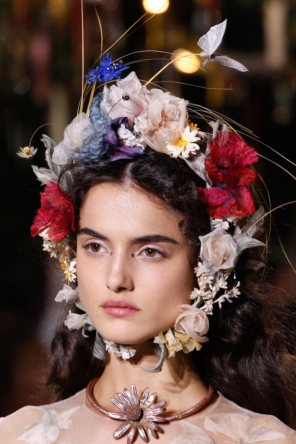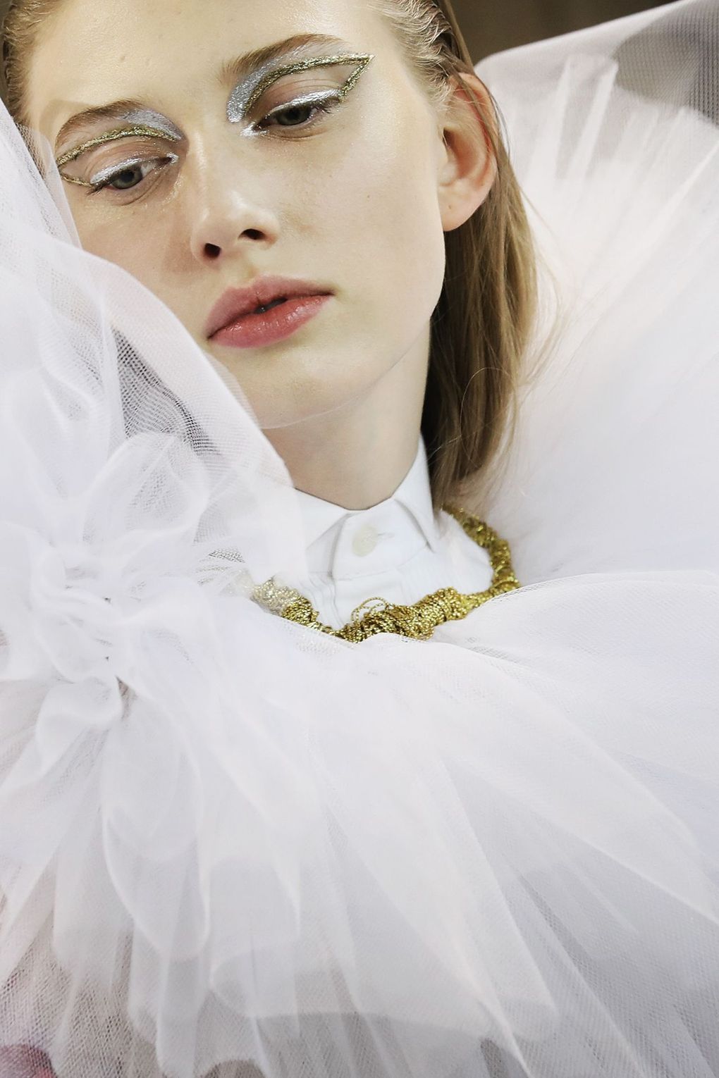Αυτά που διακρίναμε πιο έντονα ήταν τα φρέσκα, ρομαντικά πρόσωπα με λεπτομέρειες glitter και αστραφτερών αστεριών, αλλά και τα μεταλλικά ανάγλυφα σχέδια που θύμιζαν αγγέλους που κατέβηκαν στην γη. Τα μαλλιά επίσης πολύ εντυπωσιακά με μία αίσθηση αγνότητας και θηλυκότητας μη εξεζητημένης. Φανερό πλέον ότι η μόδα για την φετινή Άνοιξη/Καλοκαίρι, προκαλεί το γυναικείο φύλο να αποκαλύψει την πιο ρομαντική και αγνή του πλευρά.