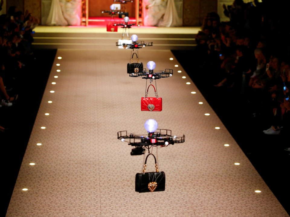 Οι χρυσές πύλες του Ουρανού άνοιξαν και αποκαλύφθηκαν τα drones. Δερμάτινες τσάντες από τη συλλογή Dolce & Gabbana Φθινόπωρο 2018 κρέμονταν πάνω τους προκαλώντας φωνές ενθουσιασμού των καλεσμένων. Ήταν ό,τι περίμενε κάποιος από μία επίδειξη Dolce & Gabbana, ένα θέαμα ιταλικής υπερβολής.