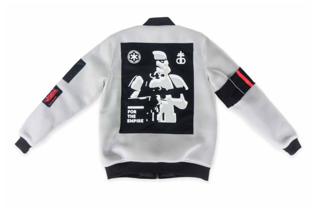 Το δεύτερο κομμάτι της συλλογής Drop Dead x “Rogue One: A Star Wars Story”είναι ένα λευκό bomber jacket, με μεγάλα χαρακτηριστικά γραφικά να είναι τυπωμένα στο μπροστινό μέρος και την πλάτη του μπουφάν – stormtroopers και tie fighters- χαιρετίζοντας έτσι τη δύναμη της σκοτεινής Αυτοκρατορίας του Darth Vader…
