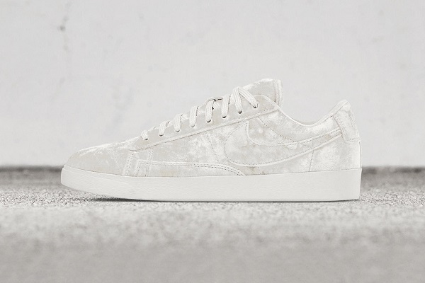 Η κλασική δερμάτινη κατασκευή των Nike Blazer αντικαθιστάται από πλούσιο βελούδο σε αποχρώσεις λευκό, μαύρο και σκούρο μωβ, διατηρώντας ωστόσο τη χαρακτηριστική λευκή χοντρή σόλα. Αν σκεφτούμε πως τα Nike Blazer σχετίζονται πολύ περισσότερο με την κουλτούρα και το στυλ του skateboard, μπορούμε να πούμε πως πρόκειται για μια ενδιαφέρουσα πρόταση, που αναμφίβολα φέρει στοιχεία πολυτελούς κομψότητας…
