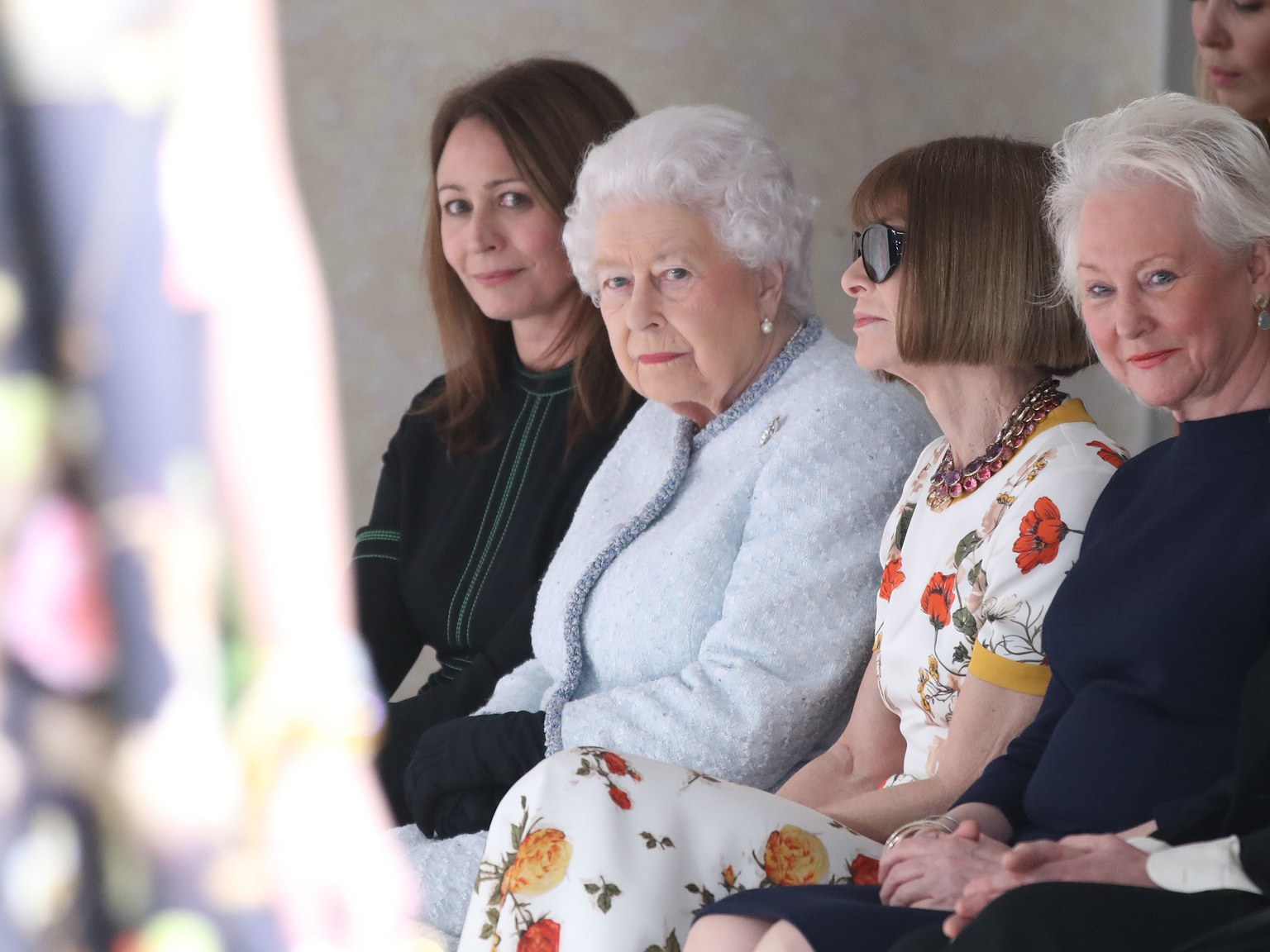 Η 91χρονη βασίλισσα, που φορούσε ένα γαλάζιο ταγέρ, κάθισε δίπλα στην Anna Wintour την αρχισυντάκτρια του αμερικανικού Vogue, ενώ τα μοντέλα παρουσίαζαν τις τελευταίες, τολμηρές και πολύχρωμες δημιουργίες του σχεδιαστή, στο τέλος της Εβδομάδας Μόδας του Λονδίνου.