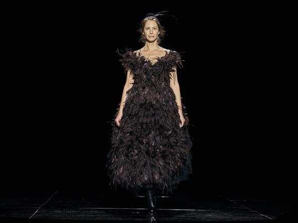 Το 50χρονο μοντέλο εμφανίστηκε με ένα εντυπωσιακό μαύρο φόρεμα από φτερά, συνδυασμένο με αντίστοιχο αξεσουάρ στα μαλλιά.