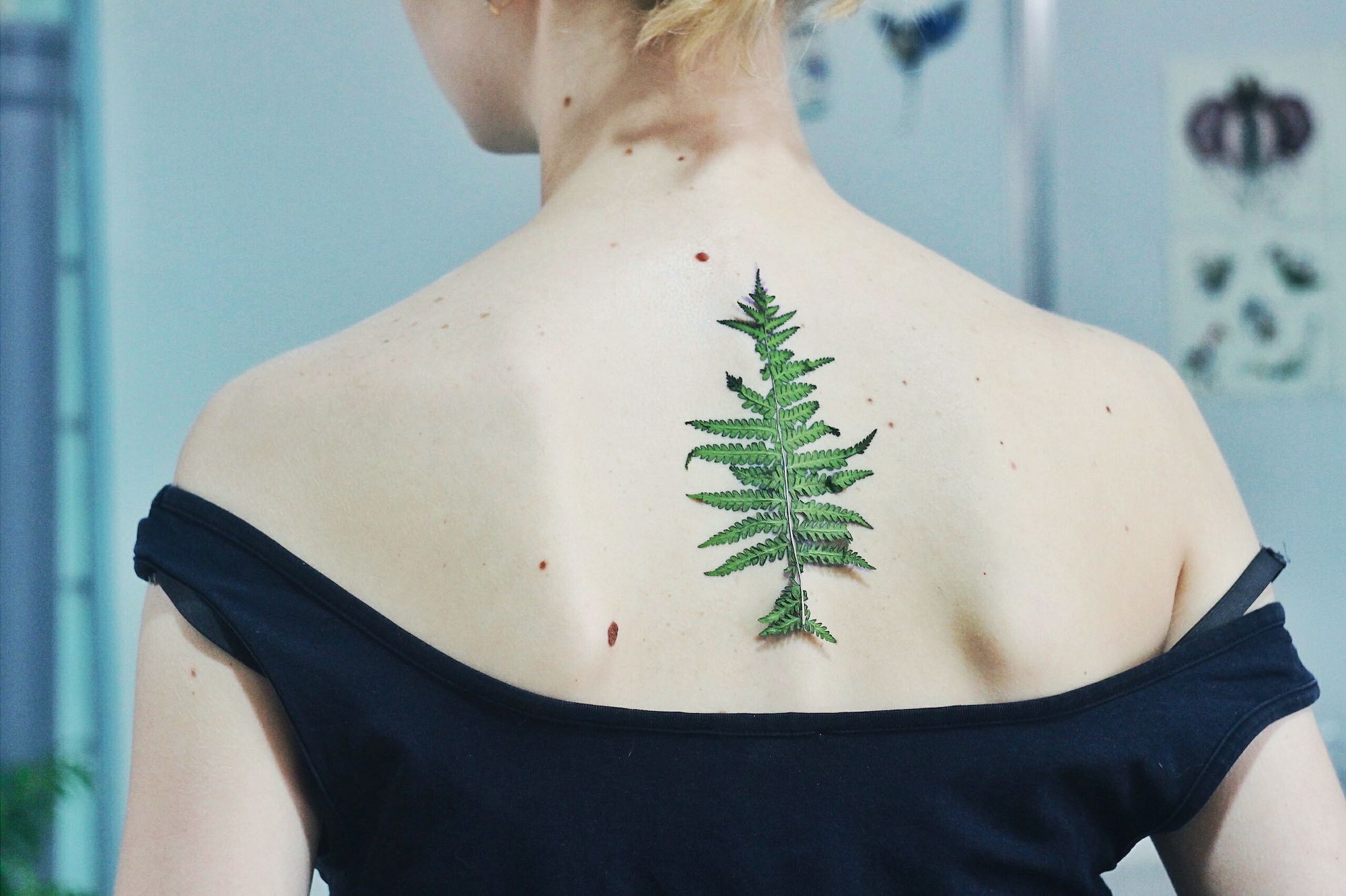 Η ιδέα είναι το stencil και η φύση! Η artist διαλέγει φύλλα ή λουλούδια που εκφράζουν την minimal αισθητική της τα οποία βάφει από την μία μεριά με μελάνι από απόσταγμα γεντιανής και έπειτα τα πατάει στο δέρμα. Αυτός είναι ο καμβάς της!