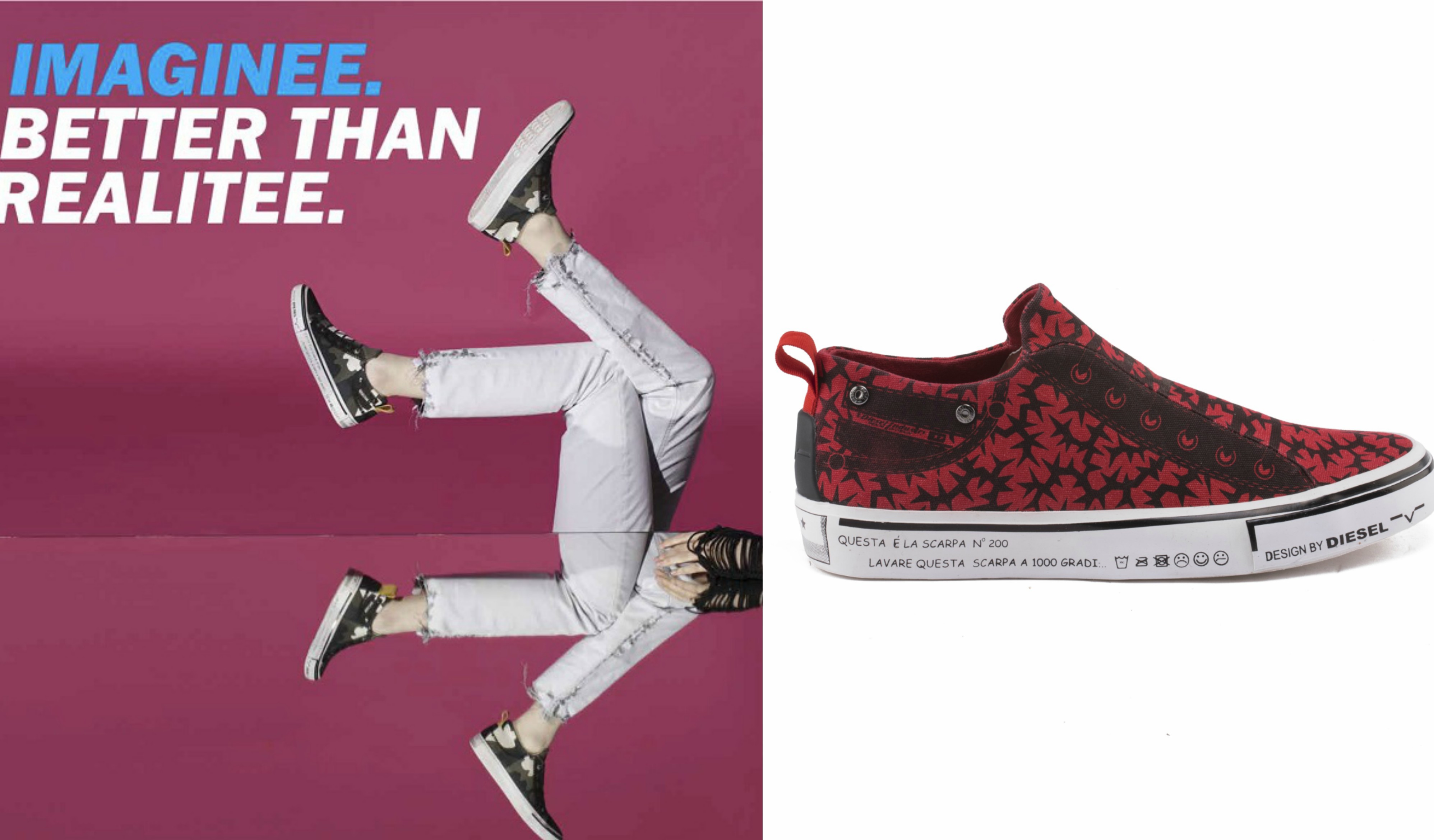 Το Imaginee αποτελεί μέρος της collection παπουτσιών της Diesel για το καλοκαίρι του 2018, το βρίσκεις σε 17 επιλογές χρωμάτων unisex – που κυμαίνονται από μονόχρωμα μέχρι ζωγραφισμένα και καμουφλάζ. Όλα τα παπούτσια έχουν τη χαρακτηριστική 5η τσέπη του Diesel στο πλάι, ενώ η εξωτερική σόλα είναι διακοσμημένη με μήνυμα στην ιταλική γλώσσα: “questa è la scarpa n ° 200. Lavare questa scarpa a 1000 gradi “από το emojis, το πλύσιμο των συμβόλων και από το αντίγραφο” design by Diesel “.