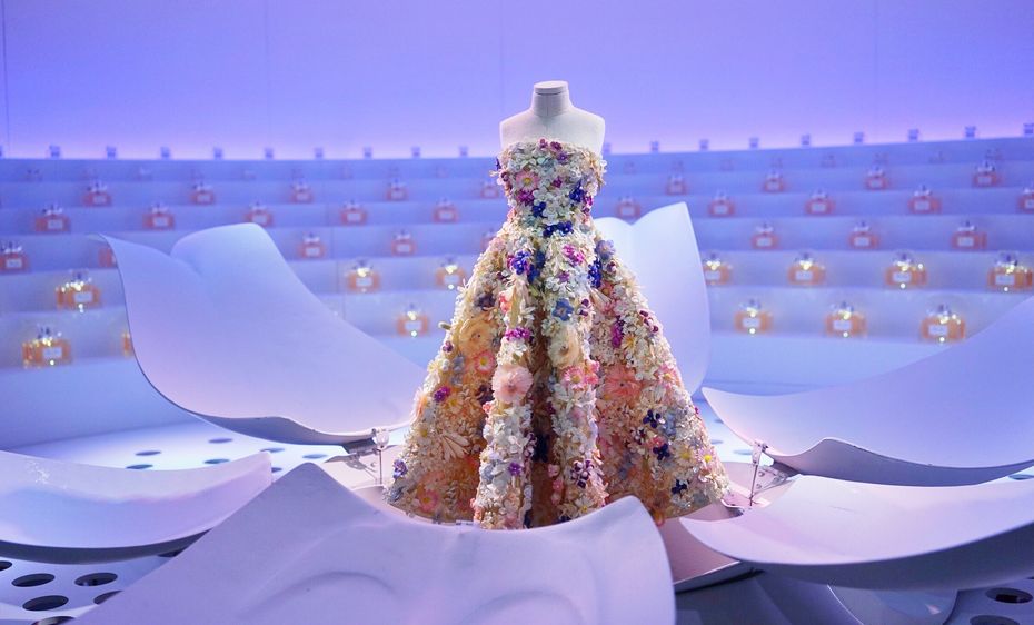 Θα γνωρίσει τον ξεχωριστό κόσμο του αρώματος J’adore, σε μια εγκατάσταση που λάμπει εξαιτίας των χρυσών φύλλων που την κοσμούν. Και φυσικά, θα κατανοήσει γιατί ο Dior ήταν τόσο παθιασμένος με τις δεξιώσεις, αντικρίζοντας ένα βαλς, όπου χορεύουν μπροστά στον θεατή δέκα φορέματα-μινιατούρες και ενώ στροβιλίζονται αποκαλύπτουν κάθε μια ξεχωριστή λεπτομέρεια.
