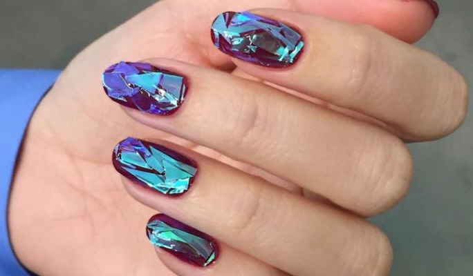 Η ίδια λέει για την τεχνική αυτή: “Αυτά τα glass nails τα ονειρεύτηκα 5 μήνες πριν, όταν βρήκα τυχαία στην παραλία ένα κοχύλι“. Στην αρχή, όπως η ίδια δηλώνει, προσπάθησε να πετύχει αυτό τον ιριδισμό στο εσωτερικό τμήμα του κοχυλιού, χρησιμοποιώντας σελοφάν που έβρισκε σε συσκευασίες από γλυκίσματα, το αποτέλεσμα όμως δεν ήταν το επιθυμητό. Έπειτα ξεκίνησε να πειραματίζεται με ρολό από holographic film, το οποίο κόβει σε συγκεκριμένα σχήματα και τα τοποθετεί πάνω στο νύχι το ένα πάνω στο άλλο δημιουργώντας στα νύχια μια “γυάλινη” υφή, τόσο ρεαλιστική που νομίζεις ότι θα σπάσει. Αυτό το film της έδωσε το αποτέλεσμα που ήθελε και έτσι αποφάσισε να μετατρέψει αυτό το υλικό σε αυτοκόλλητες ειδικές ταινίες, για μεγαλύτερη ευκολία.