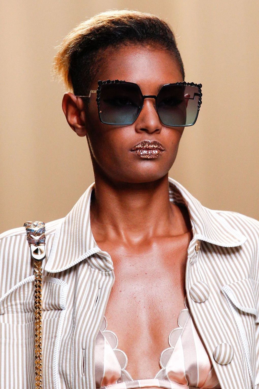 Σαν ένα καινούργιο look έμοιαζε το κοντό με τον απόλυτο συνδυασμό ενός glitter lip και γυαλιά αρκετά μεγάλα ήταν the way to go! Το pixie cut είναι ότι πιο in για τα κοντά μαλλιά, πιο θηλυκό όμως με την λεπτομέρεια της φράντζας. Είδαμε μαλλιά κοντά σε μήκος, με τα μισά από την μία πλευρά slicked-back ή ξυρισμένα και από την άλλη μεριά με όγκο και τέλος τα μαλλιά με απίστευτα κοντό μήκος που θα έλεγε κανείς… go short or go home!