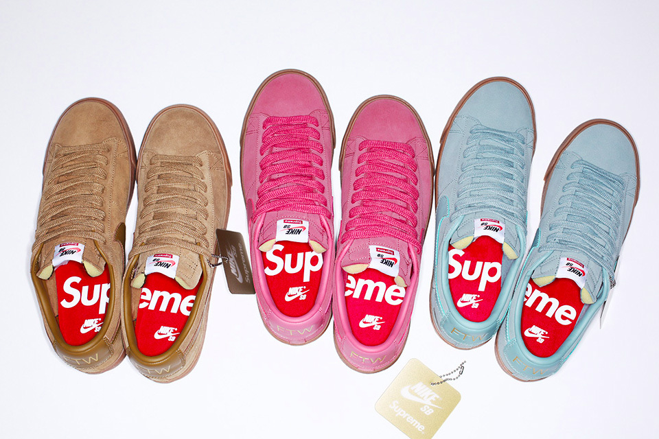 Αυτή τη φορά το αγαπημένο skate sneaker Nike SB Blazer, ανανεώνεται και αποκτά ένα διαφορετικό προφίλ, με τον τρόπο που μόνο η Supreme θα μπορούσε να το “πειράξει”. To low-top Blazer αποτελείται από suede, λαστιχένια σόλα, δερμάτινες λεπτομέρειες, ενώ κυκλοφορεί σε τρεις διαφορετικές αποχρώσεις (μπεζ, γαλάζιο και ροζ) με χρυσά γράμματα (FTW) στο πίσω μέρος του παπουτσιού και στις τρεις version.