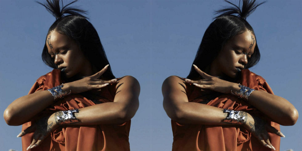 Το good girl gone bad στην κυριολεξία φαίνεται να πλασάρει καινούργιο trend το οποίο φαίνεται να μην περιέχει φρύδια…μπορεί να ακούγεται περίεργο αλλά η Rihanna φαίνεται να έχει βαρεθεί το trend του perfect brow και με την μοναδική αυθεντικότητα της να απομυθοποιεί τον μύθο της ομορφιάς αυτής. Τα δραματικά facial tattoos προσθέτουν στο μυστικιστικό ρόλο της με ένα black lip που είναι τεράστιο trend αυτή την στιγμή. Τα μαλλιά είναι punk και η μισή αλογοουρά με τα υπόλοιπα μαλλιά χτενισμένα κάτω την κάνουν ακόμα πιο επιβλητική. Τα νύχια της είναι σε nude απόχρωση για να μακραίνουν διακριτικά τα δάχτυλα των χεριών της και να φαίνονται οι χορευτικές κινήσεις της από το υπερπέραν..