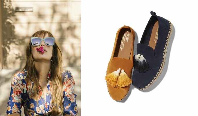Για την γυναίκα τα TOMS προτείνουν μινιμαλιστικά δερμάτινα slides και σανδάλια σκέτα ή με γραμμικά prints, όπως το Viv και το άνετο Clarita τα οποία συνδυάζουν αντιφατικά αξεσουάρ όπως pom poms και υφαντά, δίνοντας τους μια nouveau-craft πνοή. Η Katalina είναι ίσως η πιο νέα ρομαντική γυναικεία πρόταση. Ελαφρώς υπερυψωμένη ανοιχτή εσπαντρίγια με αφαίρούμενο κορδόνι, statement χρώματα και pattern όπως το κροκί και η δαντέλα ενώ το αντίστοιχο ανδρικό είναι το φίνο αλλά ελαφρώς «τσαλακωμένο» Diego που θα υπηρετήσει το day-to-night στυλ.