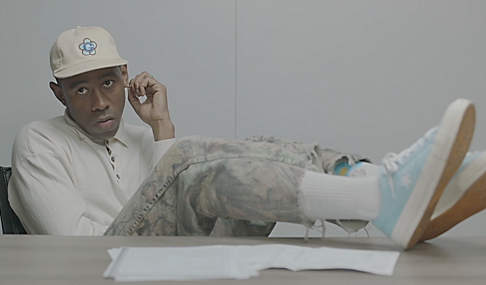 Ο Tyler ανακρίνεται για τη σχέση του με το brand και επιμένει στην απάντηση “I don’t recall” (δεν θυμάμαι), φορώντας τα νέα Converse One Star.
