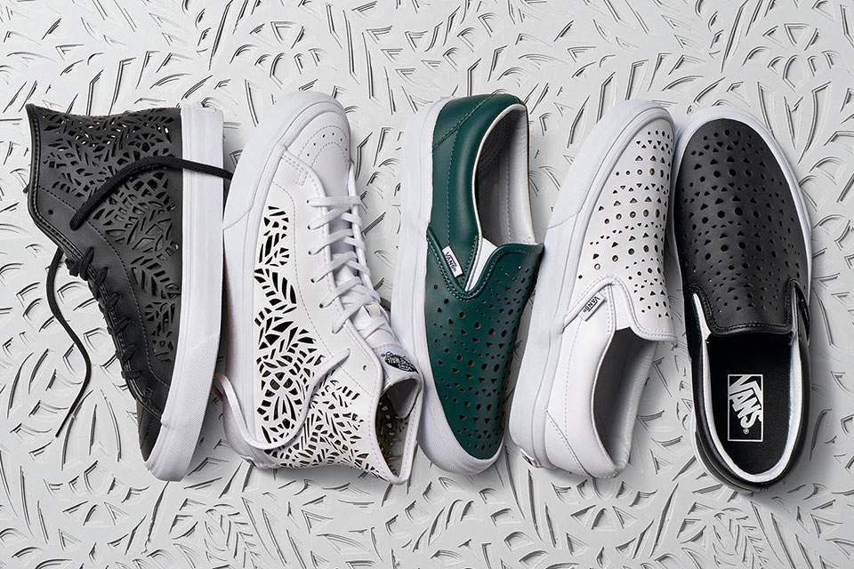 Γεωμετρικά prints, φτιαγμένα από laser κοσμούν κλασικά Vans sneakers, όπως το slip on μοντέλο και το Sk8-Hi, το οποίο βαφτίζεται πια Decon. Η συλλογή περιλαμβάνει πέντε διαφορετικά δερμάτινα sneakers, διαθέσιμα σε λευκή, μαύρη και πράσινη απόχρωση.