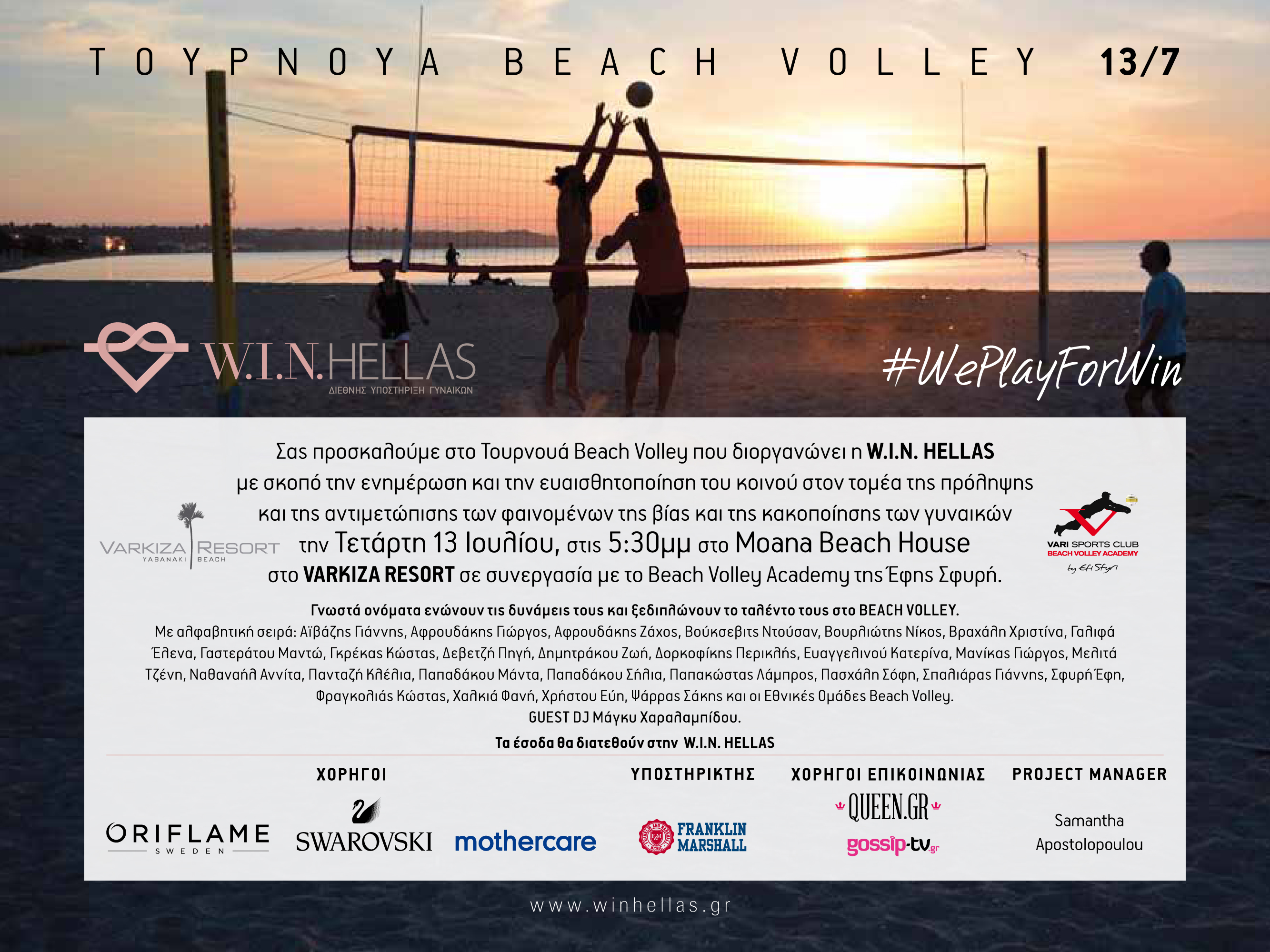 Ο Μη Κερδοσκοπικός Οργανισμός W.I.N. HELLAS διοργανώνει, σε συνεργασία με το Beach Volley Academy της Έφης Σφυρή, ένα τουρνουά beach volley που θα πραγματοποιηθεί την Τετάρτη 13 Ιουλίου και ώρα 17:30, στο Moana Beach House στο Varkiza Resort.