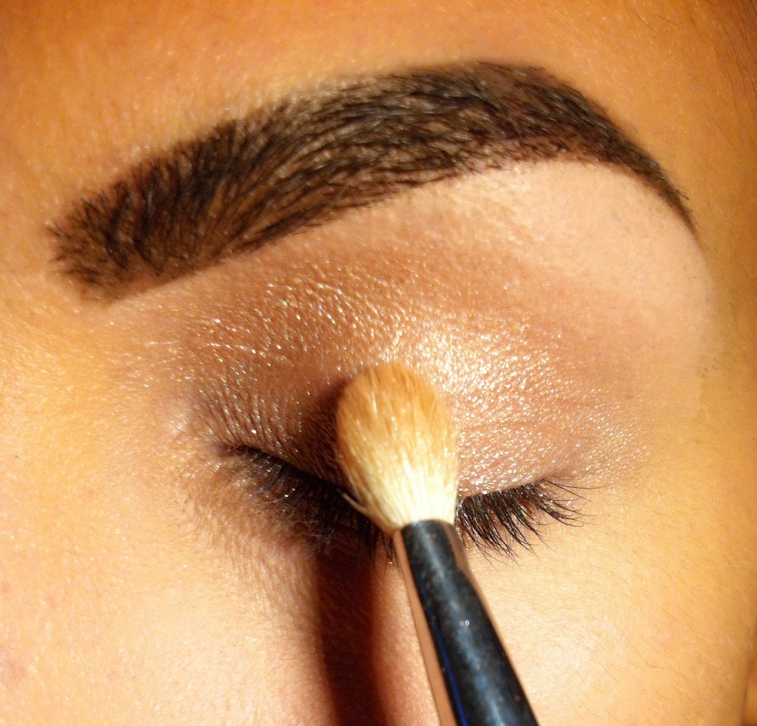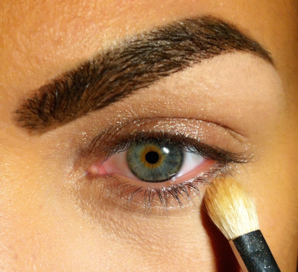 Με ένα blending brush περάστε περιμετρικά σε όλο το βλέφαρο μία μεταλλική σκιά σε φωτεινό σωμόν και στο κάτω μέρος.
