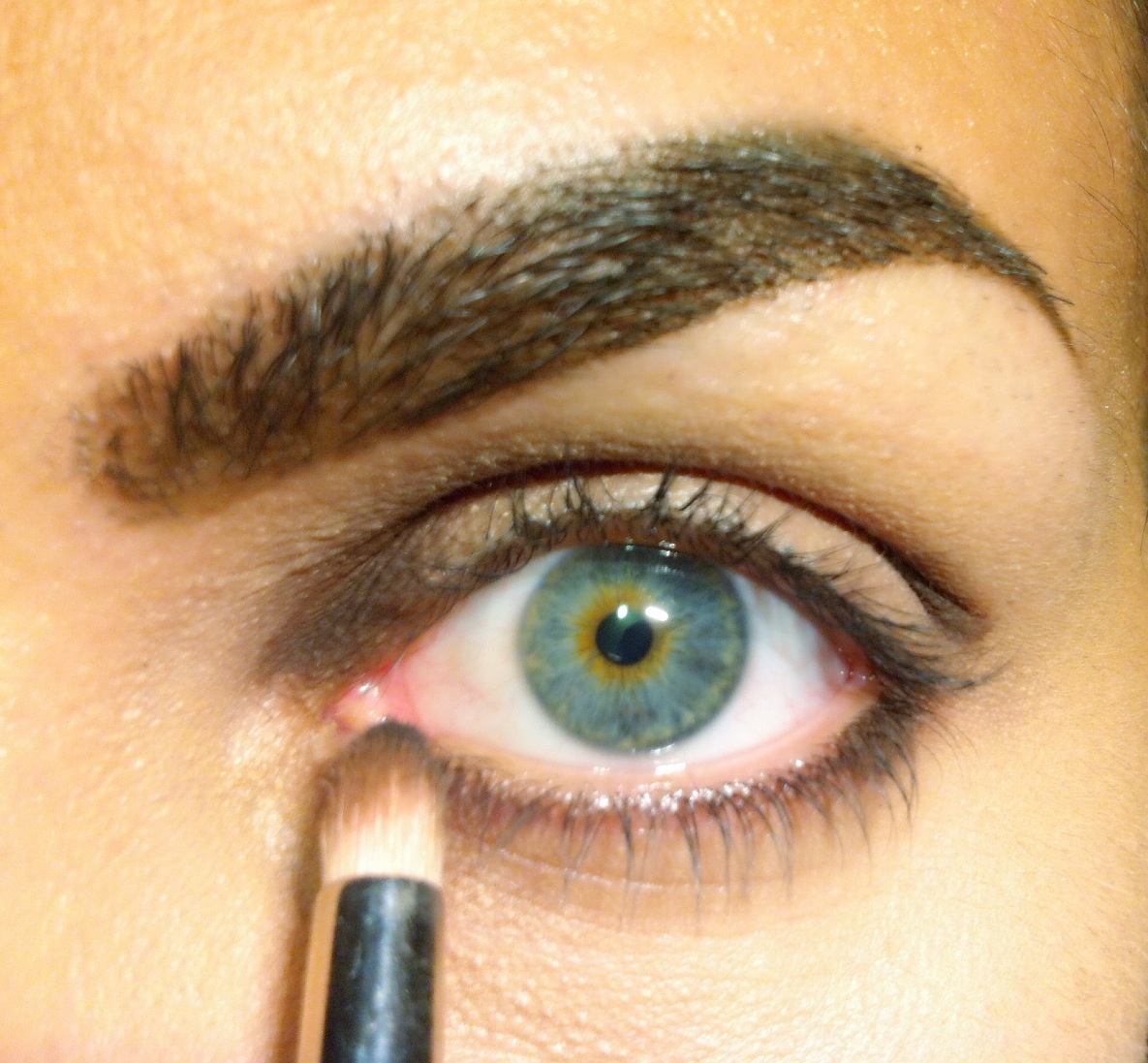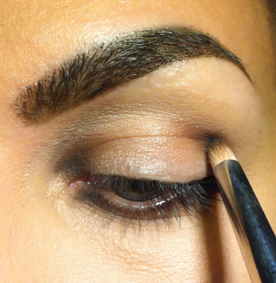 2.Με ένα pencil brush τοποθετώ μια σκούρα καφέ σκιά δεξιά και αριστερά του κινητού βλεφάρου και αφήνω το κέντρο καθαρό. Κάνω το ίδιο και από την κάτω μεριά του ματιού.