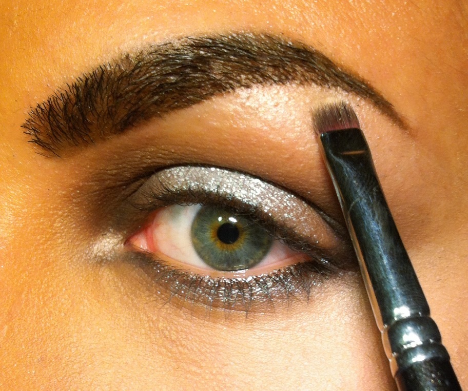 4.Magic is about to happen! Με το flat brush τοποθετώ την σκιά glitter μόνο στο κέντρο πάνω και κάτω αφού πρώτα το βρέξω. Η σκιά αυτή είναι λεπτό glitter-σκιά και όχι το κλασσικό glitter που εφαρμόζεται με κόλλα.