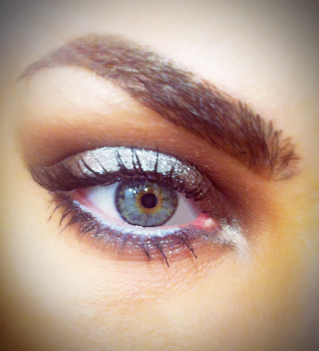 4.Magic is about to happen! Με το flat brush τοποθετώ την σκιά glitter μόνο στο κέντρο πάνω και κάτω αφού πρώτα το βρέξω. Η σκιά αυτή είναι λεπτό glitter-σκιά και όχι το κλασσικό glitter που εφαρμόζεται με κόλλα.